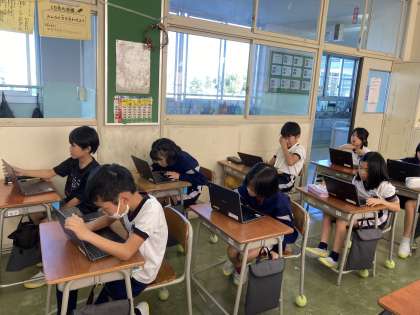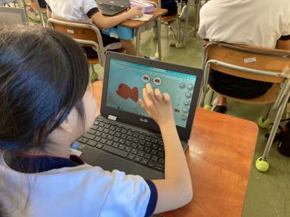 プログラミングアプリのビスケットを使い、泳いでいる魚が餌を食べるアニメーションを作成し、プログラミングの楽しさを味わいました。