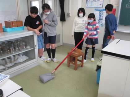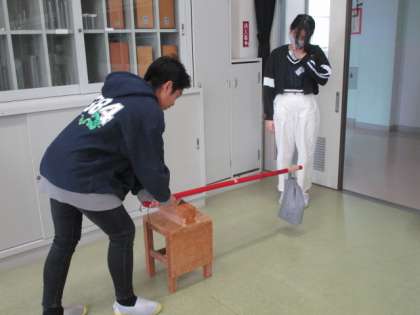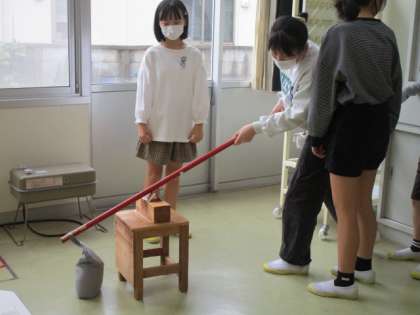 1本の棒を使って重い物を持ち上げる活動を行いました。手で押す位置を変えたり支える位置を変えたりし、手応えがどう変わるかを調べました。今後、小さい力で重い物を持ち上げられるのは、どのような時なのかを詳しく調べていきます。