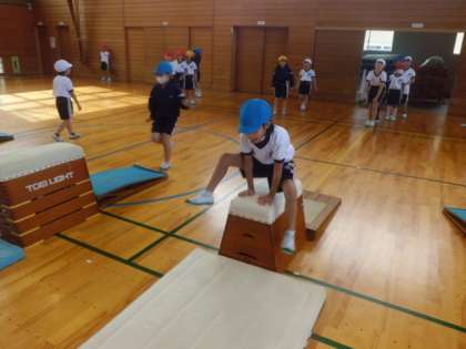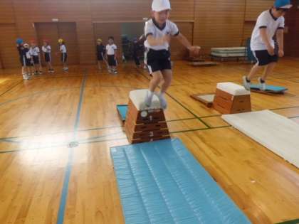 難易度別に練習しました。両足で踏み切ることや手をつく位置を確認しました。