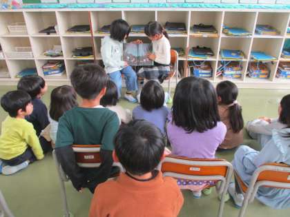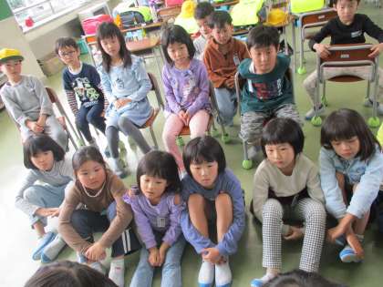 本の読み聞かせを静かに聞く1年1組でした。