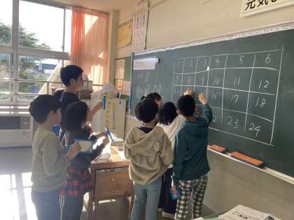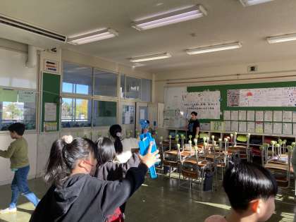 日光の光を鏡に反射させて、光は真っ直ぐ進むのか実験しました。狙った的に反射させたり、光を繋ぎ合わせたりして、光の進む先を確かめながら実験しました。