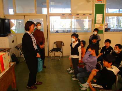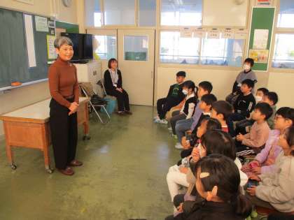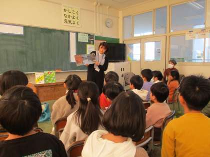 富山市立図書館の方に来ていただき、読み聞かせをしてもらいました。最初は絵本を見せず、声のみでの読み聞かせでした。図書館の方の淀みない読み方に、子供たちは聴き浸っていました。次に、豆についての絵本も読んでいただき、興味津々に聞いていました。最後に感想を伝えることもでき、より深く本に親しめました。