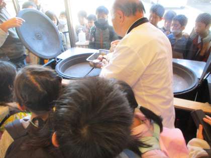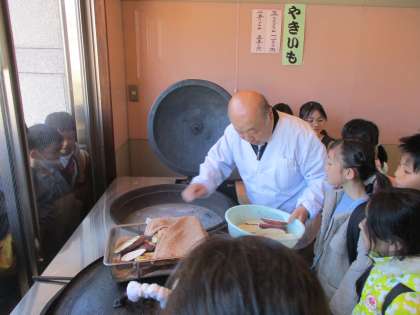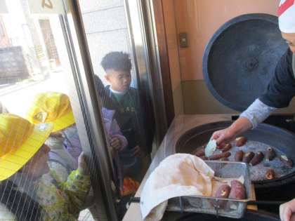 まず、山川いもや本店に行くと、焼き芋を焼いて下さいました。どんな風に焼き芋が出来るのかを、まじまじと見つめる子供たち。「大きな釜みたいので焼くんだ」「ごまと塩をかけてるよ」美味しい焼き芋ができる秘密を見付けることができました。