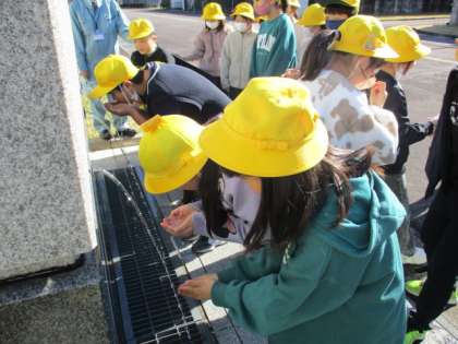 見学の最後には、浄水場でできた『できたての水道水』を飲ませていただきました。「すごく冷たい!」「おいしい!」の声があがっていました。