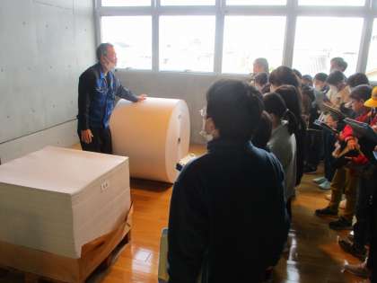 社会科見学で高岡市にあるジャポニカ学習帳の工場に行きました。使われている機械やロール紙の大きさに圧倒されながらも真剣に話を聞き、メモをとっていました。従業員や使う人の安全を考えた取り組みや製品作りの工夫をたくさん知ることができました。