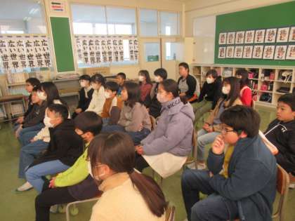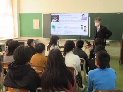 今日は富山市教育センターの先生に来ていただき、情報モラルについてお話しをしていただきました。クイズも交えながら、分かりやすく、ていねいにお話しをしていただきました。貴重なお話しを聞くことができたので、今後の生活で役立てていきましょう。