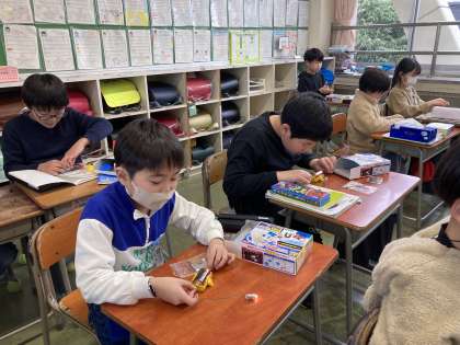 豆電球と電池を使って明かりをつけました。導線をいろいろな風に繋ぎ合わせて、どんな時に明かりがつくか考えました。