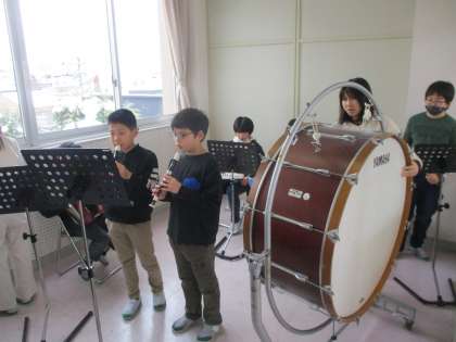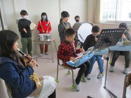 音楽の学習では、合奏「キリマンジャロ」の練習をしています。子供たちは声を掛け合いながら、リズムを合わせられるように演奏しています。