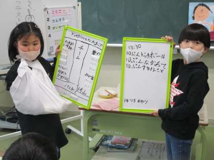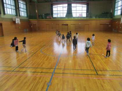 3学期の遊び係が1年1組がもっと仲良くなる遊びを企画し、楽しく安全に遊ぶことができました。「だるまさん転んだもやってみたいな。」という声も出て、次回はどんな遊びになるのか楽しみです。
