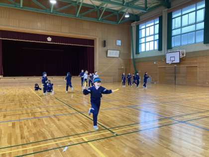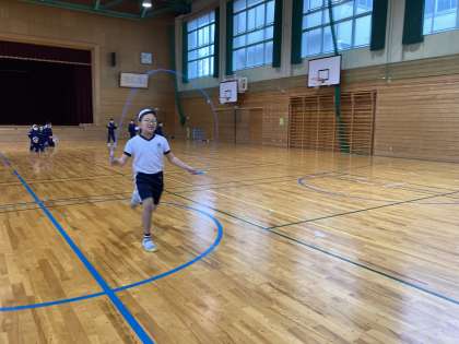 なわとびを使ってなわとびリレーを行いました。走りながらタイミングよく縄を跳び各団で勝負しました。