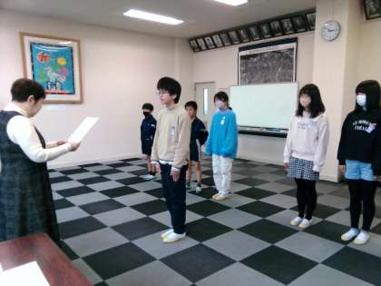運営員会の子供たちが全校のみんなに呼びかけ回収した書き損じはがきを、富山ユネスコ協会の方に渡しました。ユネスコ協会の方から感謝状をいただきました。回収したはがきは、開発途上国の支援等に役立てられます。