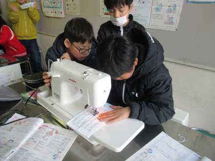 家庭科では、ミシンについての学習がスタートしています。今日は空縫いにチャレンジし、ミシンの基本的な操作に慣れました。