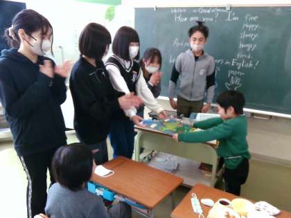 各学級へごみ箱の蓋のプレゼントを渡しに行きました。これまで一緒に過ごしてきたことへのありがとうの気持ちと、これからに向けてのメッセージも伝えることができました。