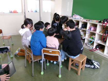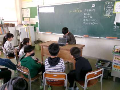 富山市の魅力について調べたことをスライドにまとめ、説明してくれました。2年生は夢中になって聞いていました。