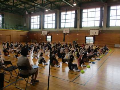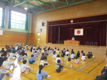 新しい教頭先生から、「かしこく、やさしく、元気よく」を目指したいと思っているか問われ、元気に挙手する子供たちです。