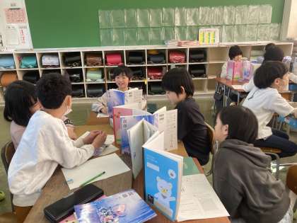 グループになり、テーマから思いうかんだものを特徴を聞き合って予想し、グループ全員が別のものをあげられるようにする学習をしました。