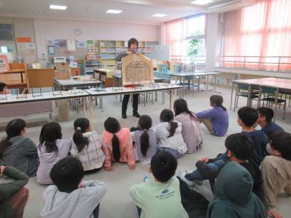 司書の先生から、本ができるまでのお話を聞きました。昔は木や粘土に文字を書いていたということを聞くと、みんな驚いていました。