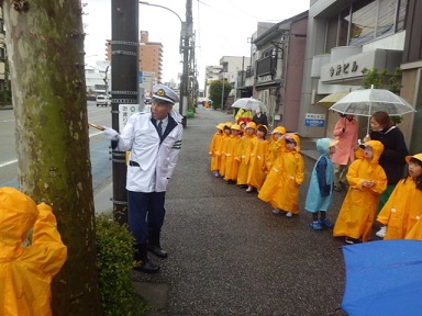 東町交番、交通安全協会、交通安全柳町支部、PTAの方々にご協力をいただき、交通安全に必要なことについて学習しました。「とまる」「みる」「まつ」の合い言葉を知りました。実際に学校周辺を歩き、安全に行動することを体験しました。
