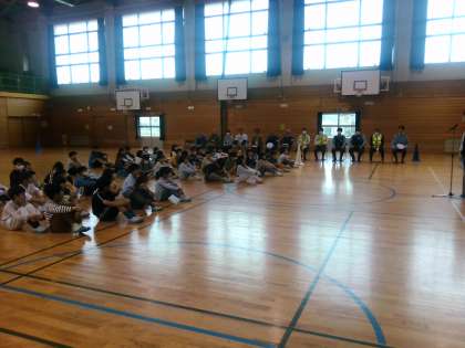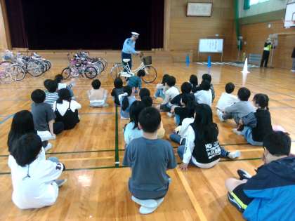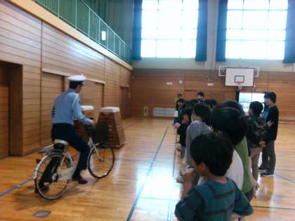 自転車教室を行いました。実際に信号や障害物を置いて、安全に止まったり、曲がったりしたながら自転車に乗り、交通安全に気を付けて乗る気持ちを高めました。