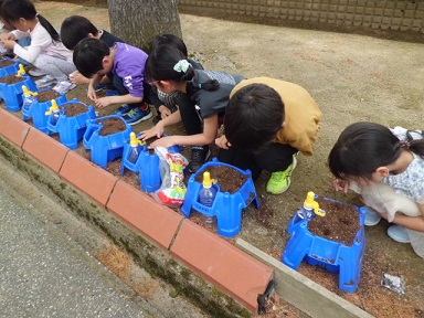 あさがおの種を観察して、自分の鉢に植えました。子供たちは、登校してまずあさがおの様子を気にかけています。