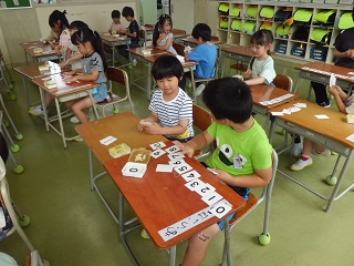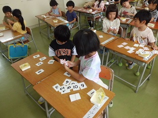 2人組になり、数図カードや数カードを使って大きさ比べをしました。カードを小さい数の順に並べて、大きさを確認していました。