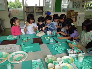 粘土で作ったごちそうを、みんなで見合いました。子供たちは、感想を伝えたり質問をしたりしながら友達の作品のよいところを見付けていました。