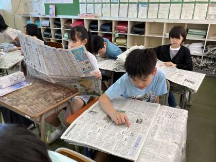 新聞を読んで新聞の工夫を探しました。文字の大きさや説明の書き方など新聞の工夫を見つけることができました。