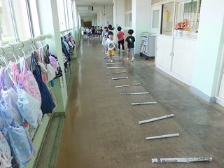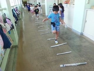 朝の時間に、簡単な運動に取り組む『やなトレ』今は、新聞ラダーで足を素早く動かすトレーニングです。子供たちは、つま先でリズムよく駆け抜けています。