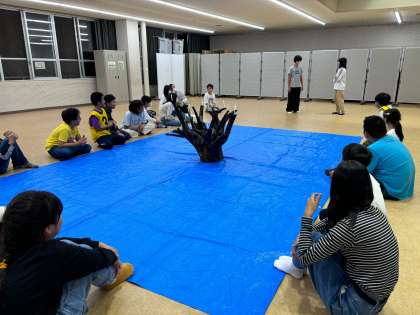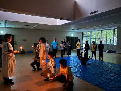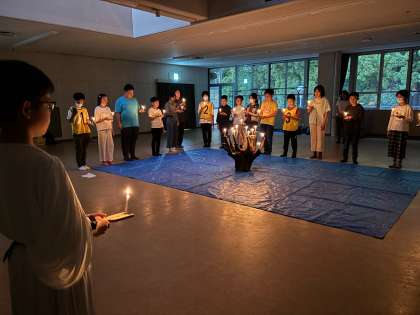 12日最後の活動はキャンドルサービスでした。第一部では、厳粛な雰囲気の中ろうそくに火を灯しました。第二部では、各班で考えたハンカチ落としや漫才、マイムマイム、6-1クイズ等の出し物で盛り上がりました。