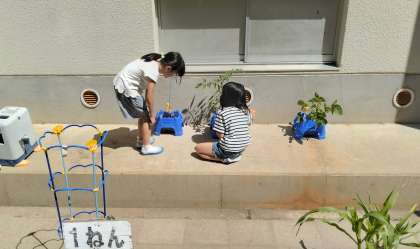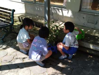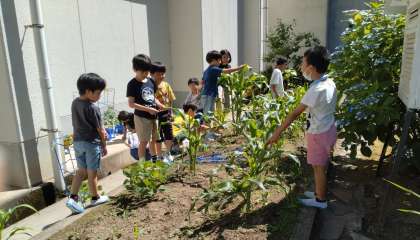 自分の野菜の大きさを見て成長を喜んだり、友達の野菜を見て心配したり、気持ちを込めて世話をしています。