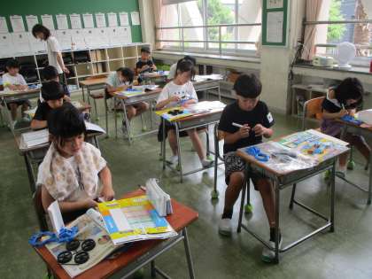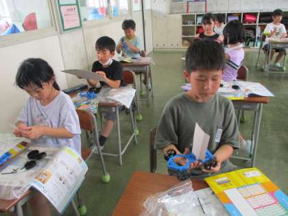 風でプラスチックチューブを動かすストランス・ビースト(オランダ語で砂浜の生命体という意味)を映像で観た後、まず輪ゴムの力で動かしてみました。
