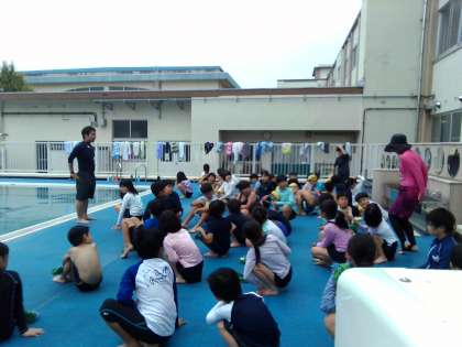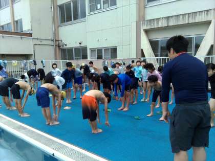 3、4年生とプール学習をしました。先生からプールの約束を確認して、入念に体操をしました。
