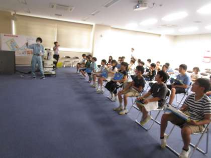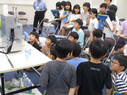 流杉浄水場に到着しました。浄水場の役割や仕組みを動画で学習しました。その後に、薬品や濾過装置の説明があり、濁った水がきれいになる様子を確認しました。