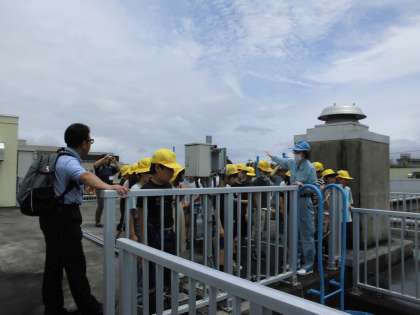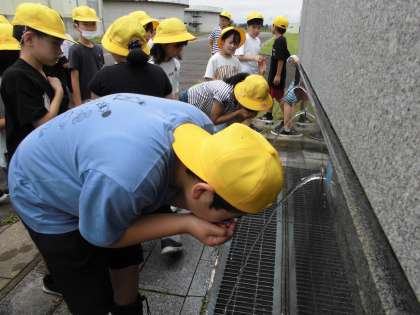 浄水場の外にある装置の様子を見学しました。出来たての水を飲み、きれいさやおいしさを確認しました。