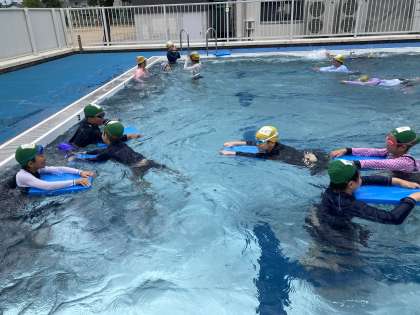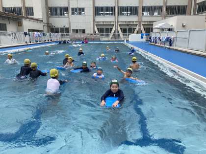 2つのグループに分かれて泳ぐ練習をしています。ビート板を使って、顔をプールにつけたり、蹴伸びしたりして泳力を高めていきました。