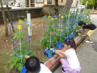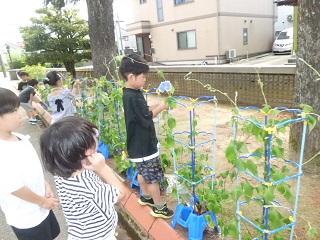 子供たちは、世話や観察をして自分のアサガオを大切に育てています。アサガオは、色鮮やかな花が咲き始めました。