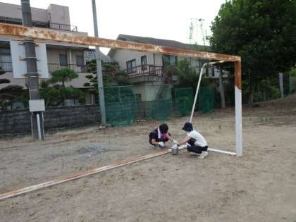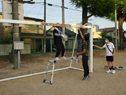 8/21、18:00より、あおやぎPTAの皆さんによるサッカーゴールのペンキ塗り作業が行われました。