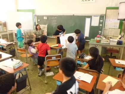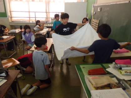再来週にせまった宿泊学習に向けて、事前指導を行っています。今日は、シーツのたたみ方を練習しました。保健係の子たちが、事前に係打ち合わせで練習したことを、クラスのみんなに見せて教えてくれました。2人一組になって、角をもち、長い辺を5回折ります。当日は、自分の使ったシーツを、速く美しくたたんで返却できるように、家でも練習してみるといいですね。