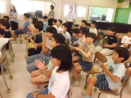 聴覚障害者協会の方が、4、5年生に手話を教えてくださいました。「ありがとう」「ごめんなさい」等の挨拶、自分の名前、身近な花や食べ物の名前の表し方等、楽しく教えてくださいました。さっそく、音楽の時間に拍手を表現したり、帰りに手話で挨拶したりと、すぐに活用していた賢い4年生です。いくつか覚えて、これからいろいろな方と楽しく交流できるようになるといいですね。