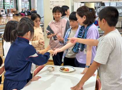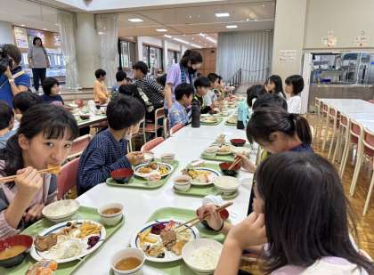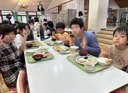 午前の活動が終わり、子どもの村での最後の昼食をいただきました。元気にもりもりいただきました。午後の活動は、この1泊2日の宿泊学習の振り返りを縦割り班ごとに行います。