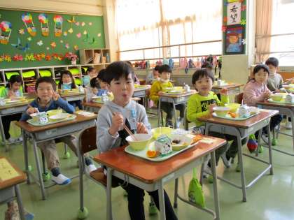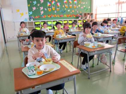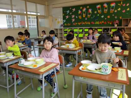 1年生にとって、初めての小学校の給食時間です。席は離したままですが、みんなで楽しくおいしくいただきました。