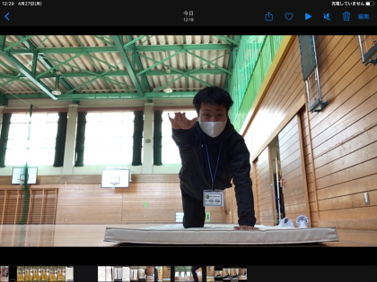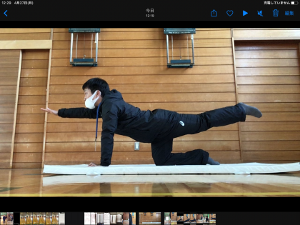 では、きょうの「先生からのちょうせんじょう!」です。下のしゃしんのようなポーズをふとんの上でとってみましょう。コツは、うでと足をまっすぐにのばし、まえを見ることです。