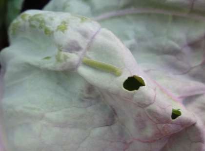 葉に穴が空いていると思ったら、幼虫(ようちゅう)がいました。(2枚目の写真)