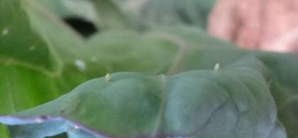 ヒント1:卵も見つけました。(3枚目の写真)1mmぐらいです。産んだばかりだと、右のように白色ですが、3日ほどで黄色になります。約1週間で卵からかえります。