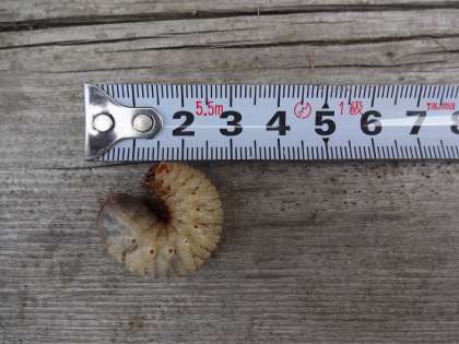 教頭先生が、畑をたがやしていると、土の中から写真の幼虫(ようちゅう)が出てきました。大きさは、体をのばすと、5cmほどです。