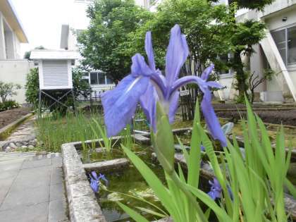 ショウブは、花のしたのほうが「きいろ」で、カキツバタは、花にしろいせんがはいっています。したのしゃしんをみましょう。花のしたはきいろではありません。また、花にしろいせんがありますね。それで、中にわの花は、カキツバタです。