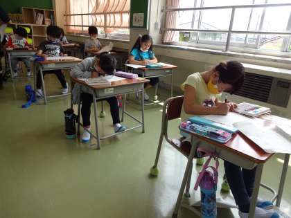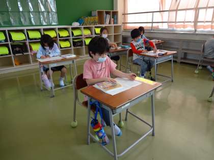 国語科の学習で、詩「あさのおひさま」を視写しました。手本をよく見ながら丁寧に文字を書きました。また、余白には、想像を膨らませて、挿絵も描きました。