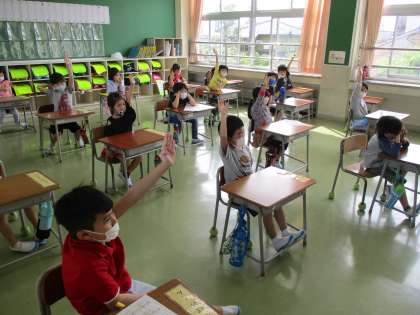 1年生は、算数の学習で、「なんばんめ」の確かめをしています。たくさんの子供が挙手をしています。
