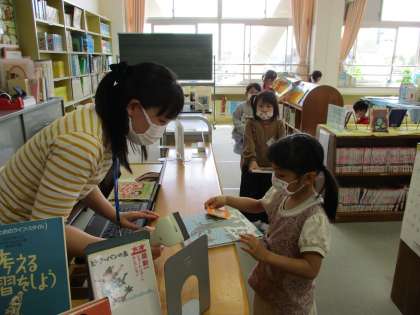 こくごかのがくしゅうで、としょしつにいきました。かようびに、おしえてもらった「ほんのかりかた、かえしかた」をしっかりとおぼえていた1ねんせい。よみたいほんをえらんで、じょうずにほんをかりていました。