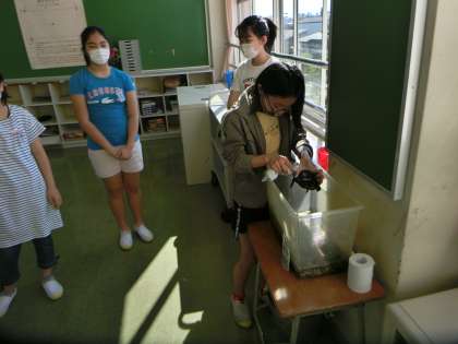 朝の時間、飼育しているかめの様子を何人かの6年生たちが眺めていました。